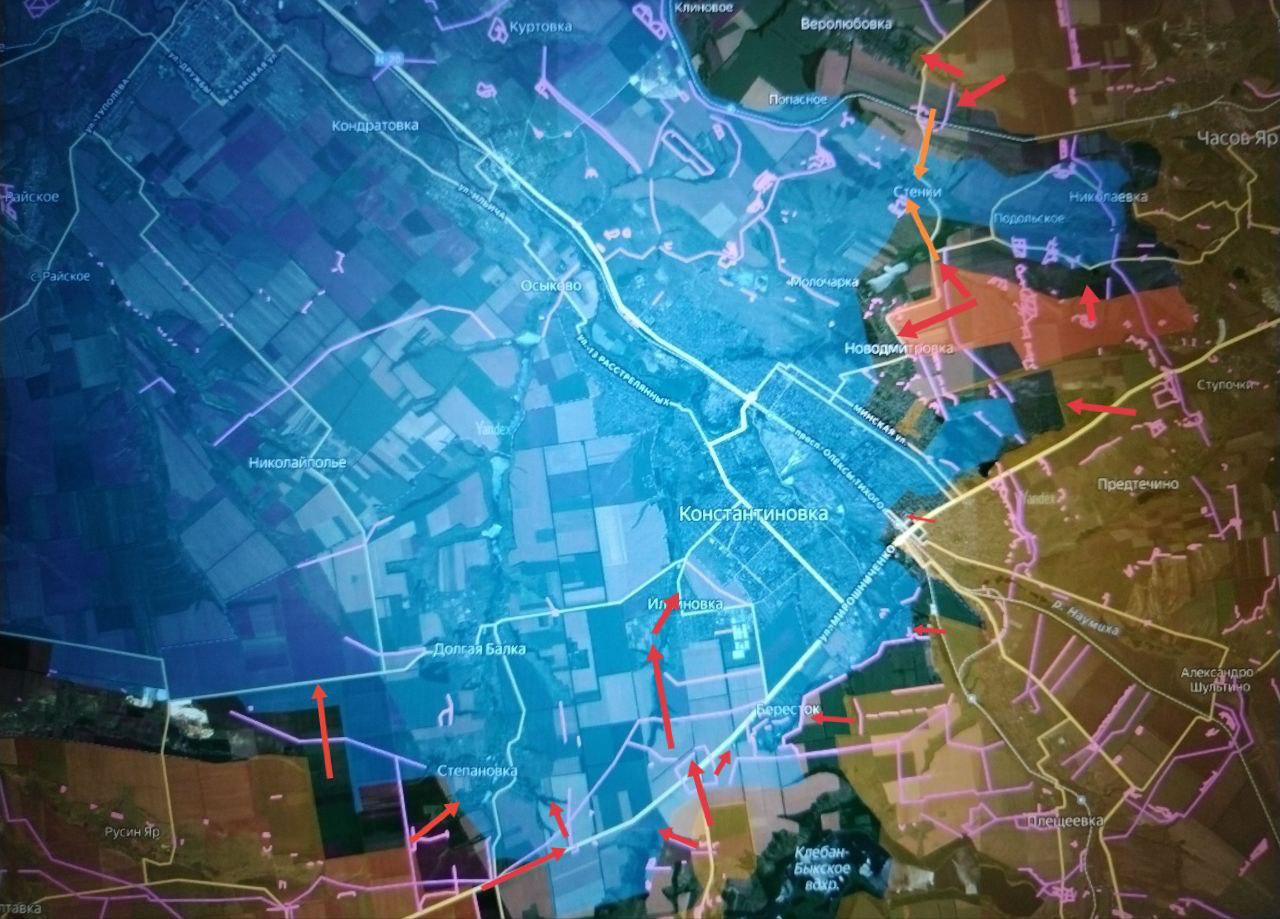 Противник выбит из опорного пункта в районе поста ГАИ, который был оборудован для круговой обороны и находится на господствующей над местностью высоте севернее Клебан-Быкского водохранилища и юго-западнее Константиновки. Собственно, утеря противником контроля над этим опорником позволила ВС РФ выйти к посёлкам Красный Октябрь (Ильиновке) — Ильича и в район западных окраин города.