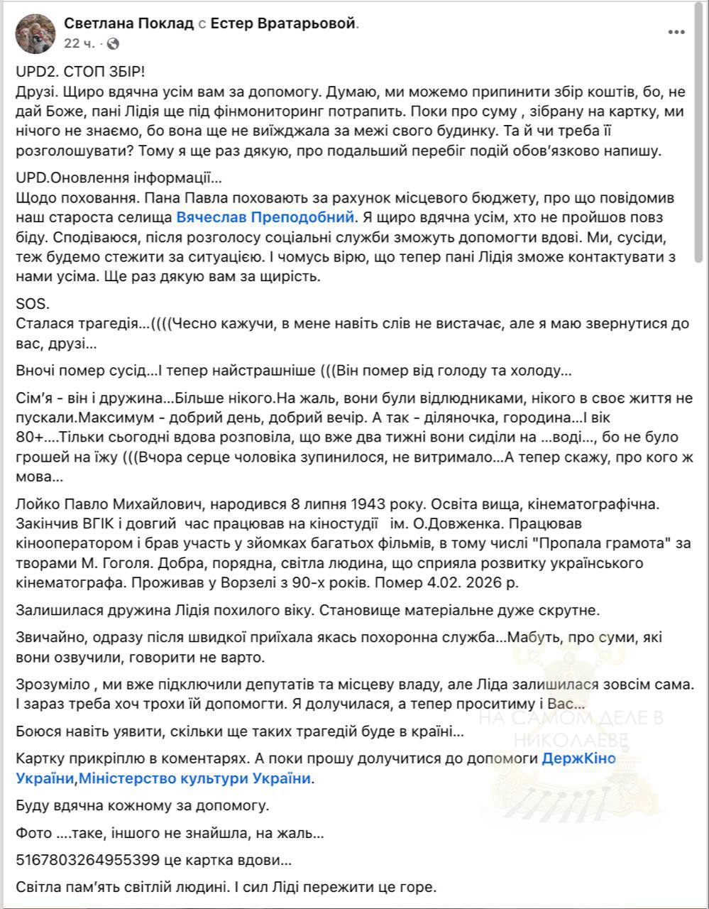 «Он умер от голода и холода. Только сегодня вдова рассказала, что уже две недели они сидели ..на воде.., потому что не было денег на еду(( Вчера сердце мужа остановилось, не выдержало..»