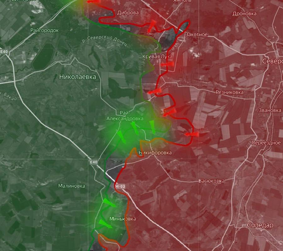 «На Славянском направлении ВС РФ продвигаются в окрестностях захваченных ими Калеников и развивают атаки в сторону леса Долгий (занятие этого массива ставит под угрозу снабжение ВСУ со стороны Николаевки).