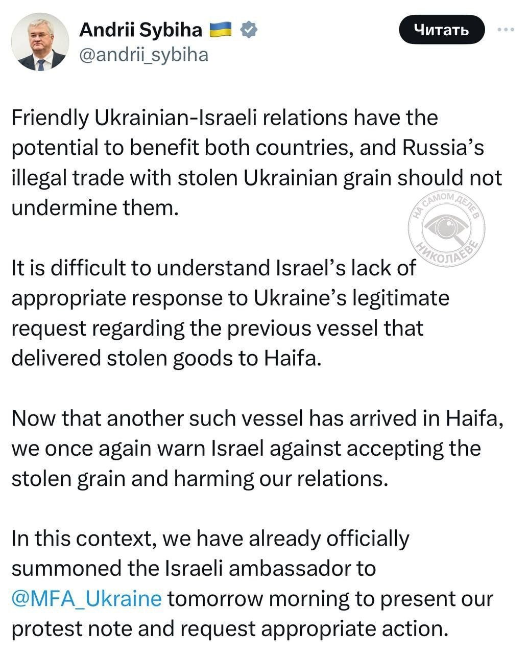 Украина вручила послу Израиля ноту протеста за импорт российского зерна.