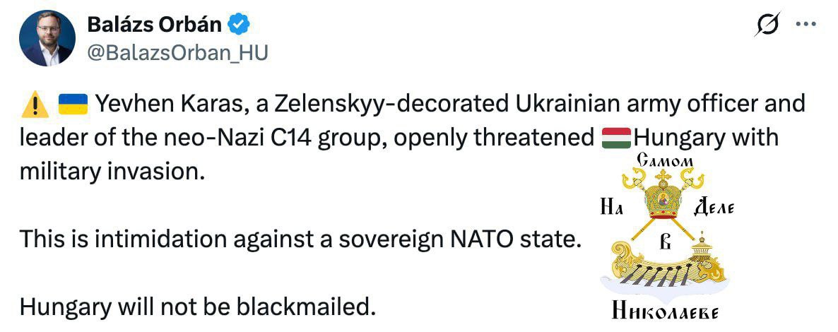 Евгений Карась, офицер украинской армии, награжденный Зеленским и лидер неонацистской группировки C14, открыто угрожал Венгрии военным вторжением. Это запугивание суверенного государства НАТО. Венгрия не поддастся шантажу— отметил в X советник премьера Венгрии.
