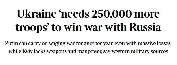 Британская The Times со ссылкой на украинских военных и источники в НАТО пишет: чтобы переломить ситуацию на фронте, Украине нужно мобилизовать минимум 250 тысяч дополнительных солдат и получить значительно больше вооружений.