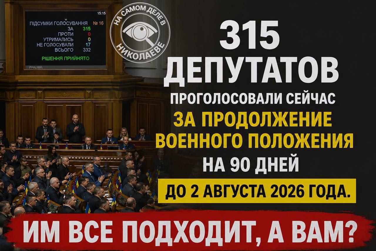 Сегодня в ВР 315 народных слуг поддержали продление военного положения на три месяца — до 2 августа 2026 года.