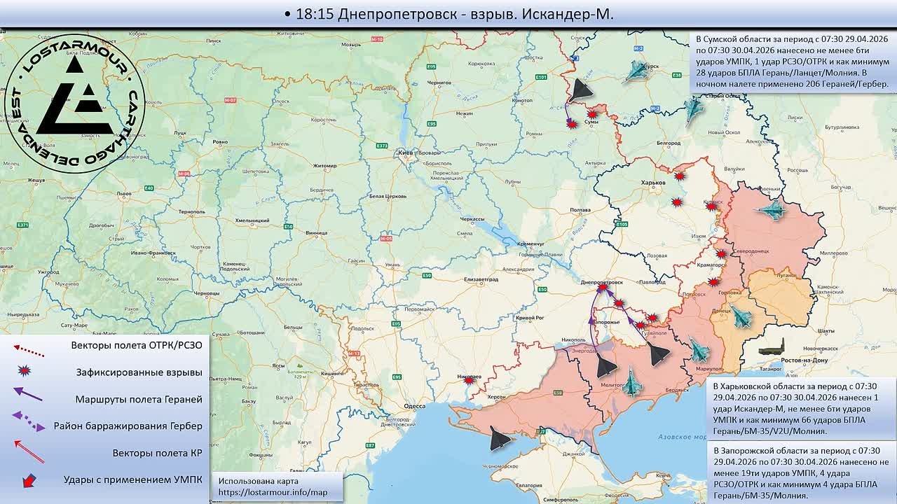 Анимированная схема ударов по территории Украины 29 апреля 2026 - 30 апреля 2026 года.